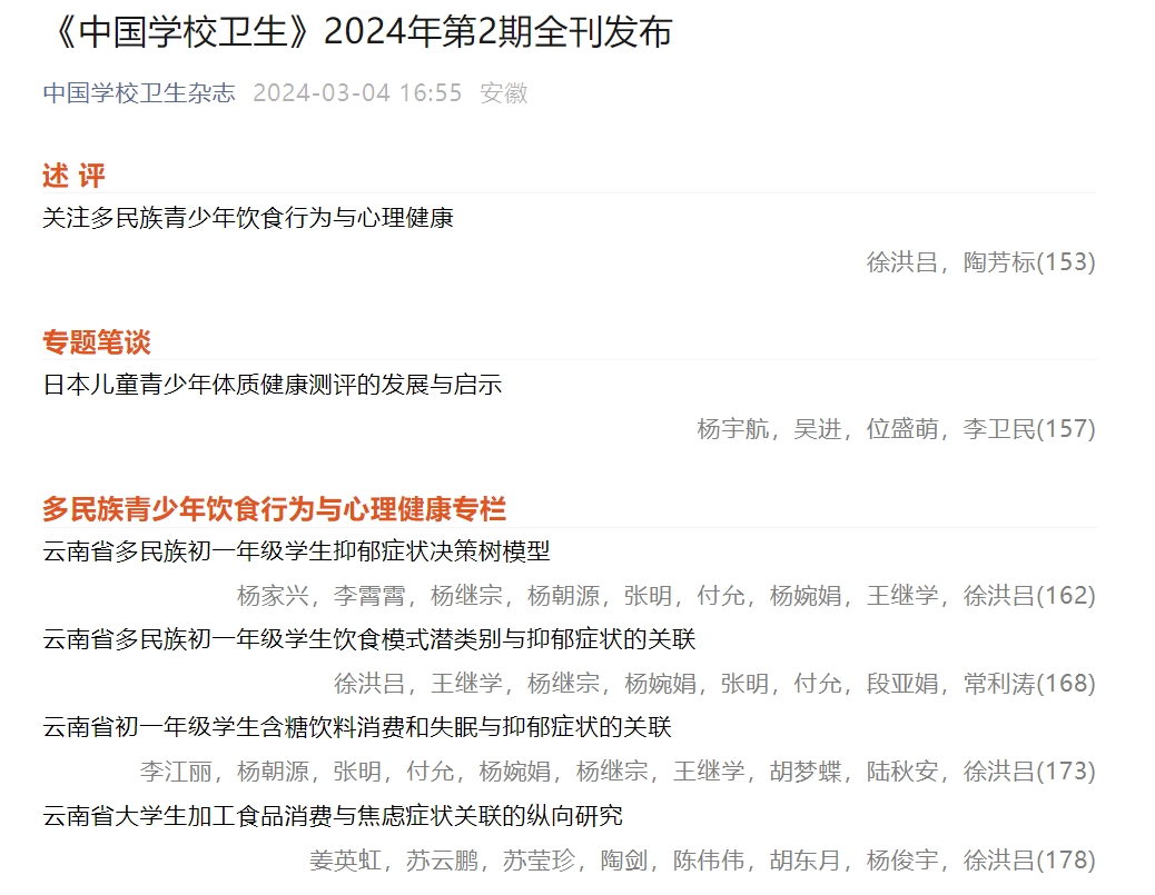 近日,Beat365唯一官方网站医学院社区护理研究团队在北大核心期刊《中国学校卫生》上发表了五篇关于多民族青少年饮食行为与心理健康的论文,其中四篇为论著,一篇为述评。团队负责人徐洪吕博士受邀组稿本期重点号“多民族青少年饮食行为与心理健康”专栏并撰写述评,其余四篇论文由徐洪吕、杨家兴、李江丽和姜英虹四位老师分别作为第一作者发表。