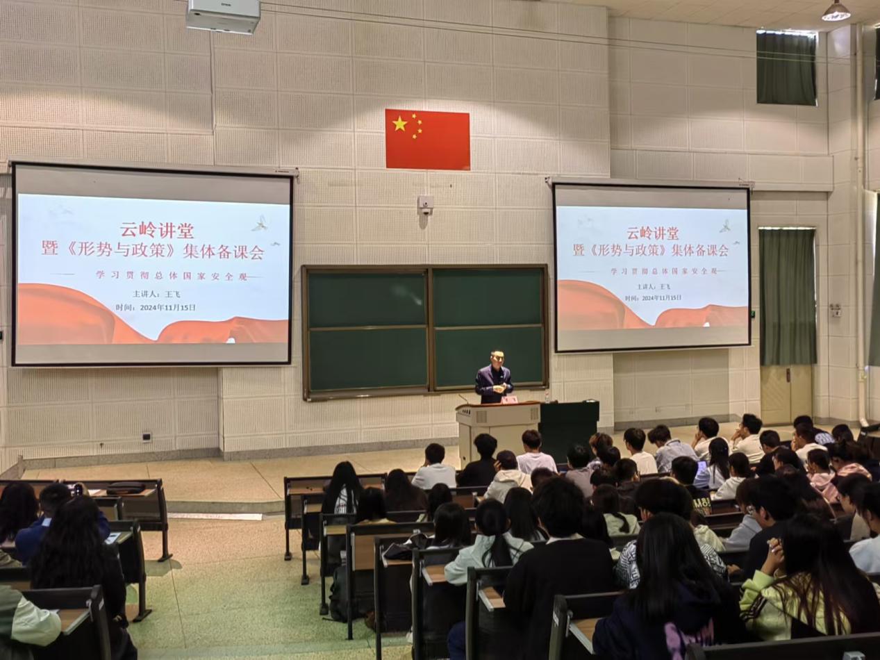 为深入贯彻落实总体国家安全观,更好地将党的二十大和二十届三中全会对于国家安全工作的要求结合进课堂,马克思主义学院于11月15日举办秋季学期云岭讲堂暨《形势与政策》集体备课会。云南省形势与政策课程研究中心副主任王飞教授受邀为学校师生授课。