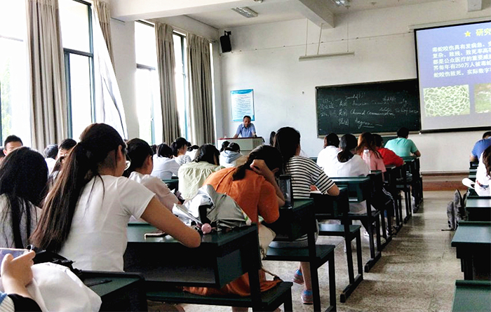 吴琼教授主要介绍了分子基多酸-席夫碱复合材料的国内外的研究进展及应用范围,以及此类材料不同组分间的协同作用机制和亟待解决的问题。当前化学科学前沿领域主要是光、电、磁、生物、药物,分子基复活材料的设计与其性质研究的发展能提高人们的医疗条件。吴老师对近期研究的复合型半导体、多金属氧酸盐抗蛇毒作用进行了简要介绍。本次讲座引起学生们的关注,并对化学与材料科学有了更多期待,同时了解到这些研究可能带来的经济效益。