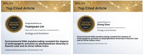 滇合中心、昆明市河湖生态健康评估与修复院士工作站林渊源、赵峥等老师2023年在Ecology and Evolution期刊上发表的论文“Environmental DNA metabarcoding revealed the impacts of anthropogenic activities on phytoplankton diversity in Dianchi Lake and its three inflow rivers”名列该期刊“2023年最高引用量前十名”。论文作者均获得了高被引作者证书。