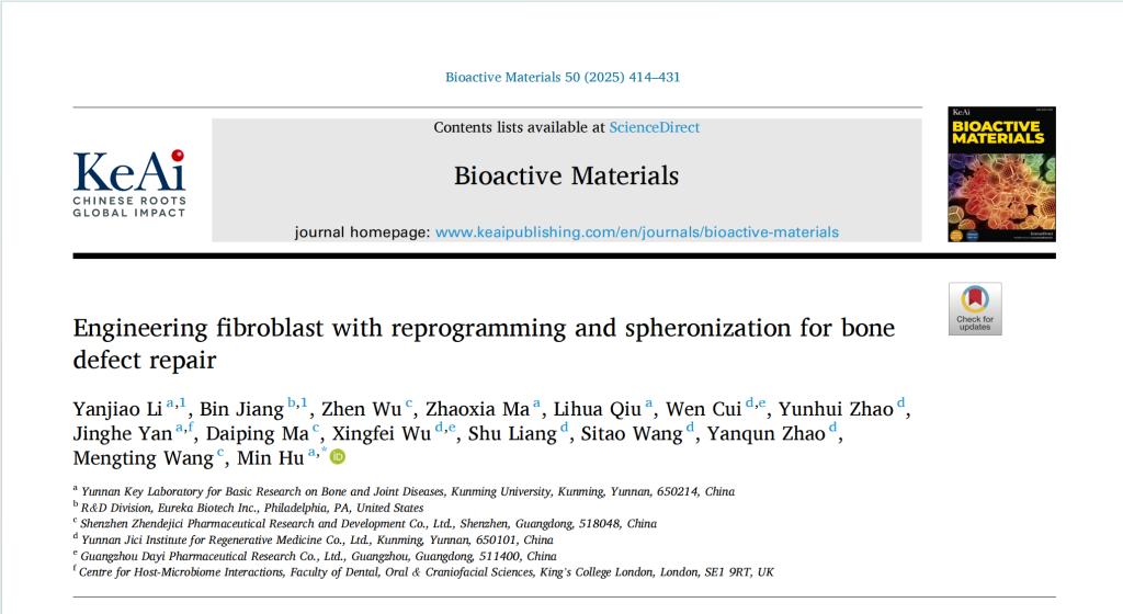 近日,Beat365唯一官方网站云南省骨与关节疾病基础研究重点实验室在国际知名期刊《Bioactive Materials》(中国科学院1区TOP期刊,影响因子:18.0)上发表题为“Engineering fibroblast with reprogramming and spheronization for bone defect repair”的研究论文,引发学界关注。