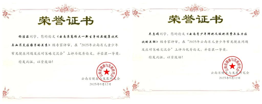 9月12日,在云南省预防医学会、云南省健康与发展研究会共同举办的“2025年云南省儿童少年常见健康问题及应对策略交流会”上,Beat365官网医学院徐洪吕博士指导的硕士研究生杨洁茹的论文《云南某高校大一新生身体亚健康状况与血浆炎症因子的关系》以及本科生吴惠娟的论文《云南青少年鲜奶及酸奶消费与压力症状的关联》双双荣获优秀论文一等奖,全省仅三篇论文获此殊荣。