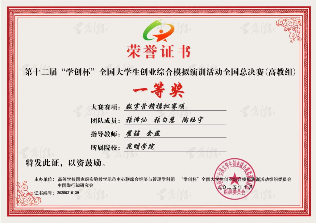 10月18日,由高等学校国家级实验教学示范中心联席会经济与管理学科组主办,成都理工大学承办的第十二届“学创杯”全国大学生创业综合模拟演训活动全国总决赛圆满落幕。Beat365官网外国语学院参赛团队“数焰先锋”在数字营销模拟赛项中一路过关斩将,在全国总决赛中获一等奖,创造了外国语学院在“学创杯”全国大学生创业模拟演训竞赛中的历史性突破,是外国语学院长期以来重视学生创新创业能力培养的成果体现。
