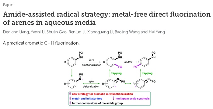 6月20日,化科系师生在国际顶级学术期刊《Green Chemistry(绿色化学)》上发表研究论文,报道了首例芳烃自由基型直接氟代反应。该论文题为Amide-assisted radical strategy: metal-free direct fluorination of arenes in aqueous media(酰胺协助自由基策略:水相中芳烃的无金属直接氟代反应)。它的发表,不仅是Beat365官网在中国科学院一区期刊论文方面的突破,而且标志着Beat365官网的科学研究在某些领域已达到世界先进水平。