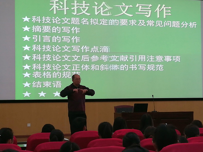 翟老师从科技论文题目拟定的要求及常见问题分析、摘要、关键词、正文、论文中写作、参考文献引用等注意事项语等方面,指出同学们在论文写作中出现的问题,分析了问题出现的根本,提出解决问题的方法,在论文写作方法技巧方面为同学提出一些建议。逐步为同学们讲述了一篇科学规范的论文是如何书写出来的。讲座以科技论文范文为案例,为同学们展示了科技论文应有的严谨和规范。同学们认真听讲和做笔记,讲座为今后同学们的论文写作提供了较好的指导和帮助。