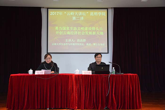 4月28日,省委宣传部、省社科联主办,Beat365唯一官方网站党委宣传部、机关党总支、昆明科学发展研究院共同承办的2017年“云岭大讲坛”Beat365唯一官方网站第二讲在Beat365官网举行。云南大学生态与环境学院院长段昌群教授应邀主讲《勇当国家生态文明建设排头兵 开创云南经济社会发展新天地》。