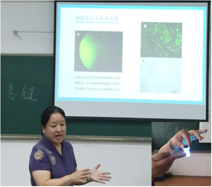在报告中,张晋老师首先介绍了如何通过层数,尺寸大小等特征来区别石墨烯量子点(GQDs)与碳量子点(CQDs),接着介绍了“自下而上”和“自上而下”的方法制备碳量子点和合成原理,重点介绍了以柠檬汁和橙汁为碳源,利用水热法制备碳量子点及其工艺参数,并为大家详细讲解了碳量子点的荧光特性、发光机制以及荧光调控方法。随后,张老师介绍了碳量子点在生物学、医学、光电子器件等领域的应用,比如,细胞标记与生物成像,碳量子点发光二极管。张老师深入浅出的报告,使大家在知识拓展和科研上都受益匪浅。报告结束后,张老师同大家进行了热烈的讨论,分享了自己的生活、求学和科研的经历和经验;参观了云南省高校有机光电子材料与器件重点实验室,并就以后拟开展的科研合作内容进行了深入的讨论。