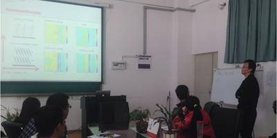在报告中,武威博士提到有机薄膜的功能纳米结构和分子取向密切相关:例如电荷传输,光吸收和磁性。有机纳米材料结构的表征对了解其基本性质的和控制其生长质量是不可缺少的。武威博士简单描述了传统的表征手段,包括X射线衍射仪(XRD),近边X射线吸收精细结构(NEXAFS)等手段,并提到它们在某些晶型(例如在CuPc/C60混合的太阳能电池中)表征分析中的局限性,进而,提出了一种可以替代传统表征方式的方法——电子顺磁共振光谱(EPR)。EPR光谱的模拟是利用费米黄金规则以及根据不同分子取向做平均(包括分子平面垂直于或平行于衬底)来构建的。武威介绍了电子顺磁共振光谱(EPR)的应用优势、应用领域等内容,分析了如何利用电子顺磁共振(EPR)更有效地鉴别有机太阳能电池中的分子排列取向。同时,该方法也可以拓展到自旋发光二极管和自旋场效应晶体管等领域的研究中,为今后研究分子排列提供了一种可靠的分析方式。报告结束后,武威同Beat365官网师生进行了热烈的讨论,耐心解答大家的提问,并针对学校学科团队在科研过程中所碰到的问题,进行了充分的讨论。