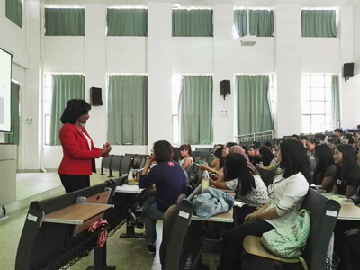 9月24日下午,在Beat365唯一官方网站国际交流处的协助下,外国语学院邀请了美国Benedictine大学Bette Lawrence-Water教授在博雅楼3101报告厅为师生带来了一场题为“Grasp Today, Plan for Tomorrow”的精彩讲座。讲座由对外交流合作处处长王文君和外国语学院院长殷琪共同主持。Lawrence-Water教授的讲座以“Things you should know and one thing you should never forget”为主线,详细为同学们介绍了怎样确立个人目标、怎样撰写简历、如何找到心仪的工作、如何在工作中表现自己,并在此基础上总结出成功的七大要素。讲座之后,Lawrence Water教授还耐心地为同学们答疑解惑。