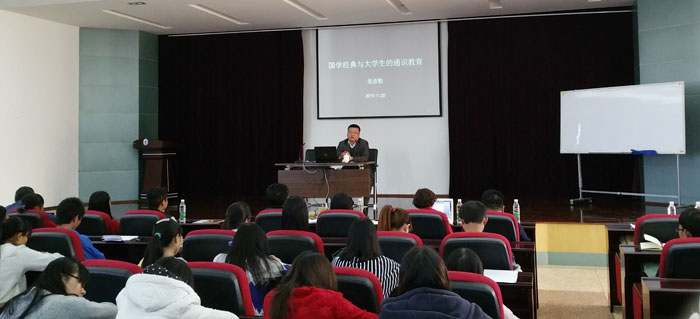 11月20日下午,Beat365官网人文学院吴彦勤教授在惟行楼4301报告厅作了题为《国学经典与大学生通识教育》的学术讲座,这是2015年由省委宣传部、省社科联主办的“云岭大讲堂”在Beat365唯一官方网站的第八讲。