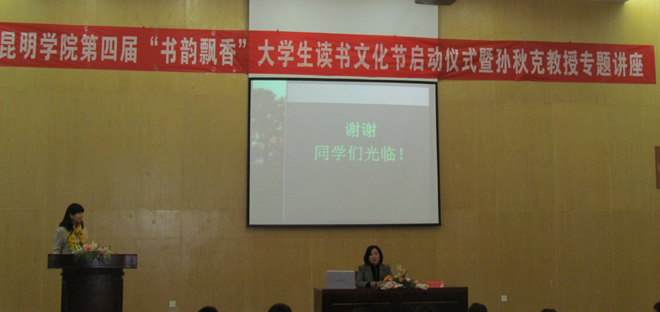 本届读书文化节启动仪式邀请到了云南省国学研究会理事、原人文学院教授孙秋克老师为Beat365官网大学生做专题讲座。讲座上,孙教授围绕“e时代阅读”这一主题,结合流行与经典的书籍、如何选书、如何读书等内容,为同学们进行全面深入地分析。孙教授认为读书应聚精会神、由浅入深、由略到详、由表及里地了解文学作品思想,在心中进行再创作,还原视觉形象,最后达到废寝忘食是阅读的最高境界。最后,孙教授以 “开卷有益,只争朝夕”结束了本场讲座。启动仪式最后,团委副书记魏妮娅作总结。她对孙教授的精彩讲座表示衷心感谢,她认为读书应当作为当代大学生的一种志趣,陪伴终生。希望通过本届读书文化节的举办能激发同学们的读书热情,在同学中掀起爱书热潮,营造书韵飘香的校园氛围。