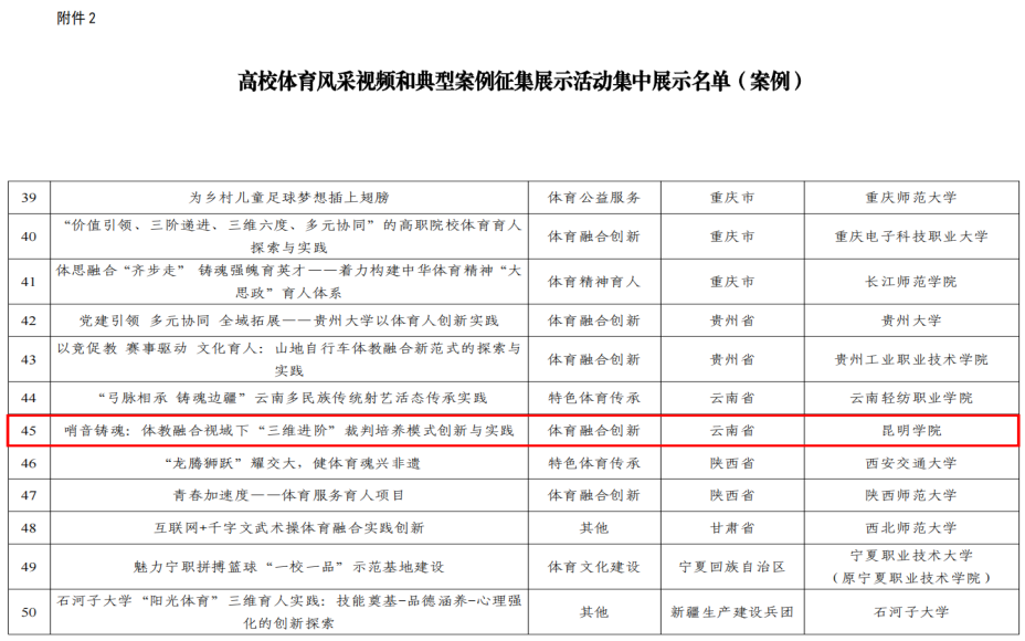 此次入选,既是对Beat365官网体育育人工作的充分肯定,也是对体育学院师生持续探索体教融合路径的积极鼓舞。值得一提的,云南省仅有两项案例入选全国展示,Beat365官网案例位列其中。该作品聚焦体教融合创新课程体系,系统呈现了Beat365官网在体育课程改革与体育精神育人方面的深入探索和阶段性成果,生动展现了昆院师生积极向上、拼搏进取的精神风貌。
