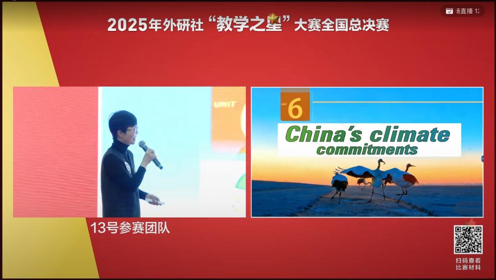 决赛现场,张茗沁老师与赵瑾老师代表团队从服务国家战略需求出发,科学、灵活运用数字教材与智能平台,充分展现新时代外语教师的卓越风采。课程基于《新一代大学英语(第二版)综合教程1》,以“中国气候承诺的全球叙事”为内容载体,围绕问题驱动、实践体验、多元化评价、德育融入及延伸任务等关键环节,系统构建了“深耕课文、事实论证与观点构建的思辨培养与批判性价值观塑造”三位一体的教学框架。教学设计充分融入数智化手段,应用U校园AI版与AI智能体评价等技术工具,协同推动教学环节的情境构建与师生反馈,构建教师、学生与AI智能体“三位一体”的学习模式,引导学生在掌握批判性阅读核心技能的同时,培养作为中国故事讲述者的文化身份认同与国际传播能力,帮助学生树立全球视野、增强社会责任感,实现了思想性、知识性与方法创新的有机统一。