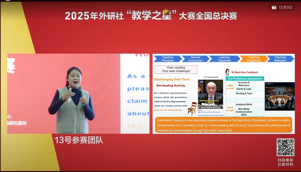 12月5日,2025年外研社“教学之星”大赛全国总决赛在北京举办,并于线上同步直播。本次全国总决赛19组参赛团队同台竞技,10万余名教师在线观摩。大赛以“讲述中国,沟通世界”为主题,共同探索外语教材有效使用的创新路径,共同研究数智赋能外语教学的实践方案,共同分享提升教学实效、落实立德树人目标的宝贵经验与教学智慧。